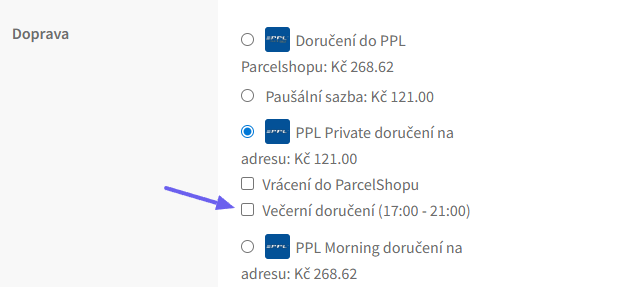 Večerní doručení aktivujete zaškrtnutím checkboxu Povolit PPL večerní doručení (17:00 – 21:00). Večerní doručení je dostupné pouze u některých způsobů dopravy.