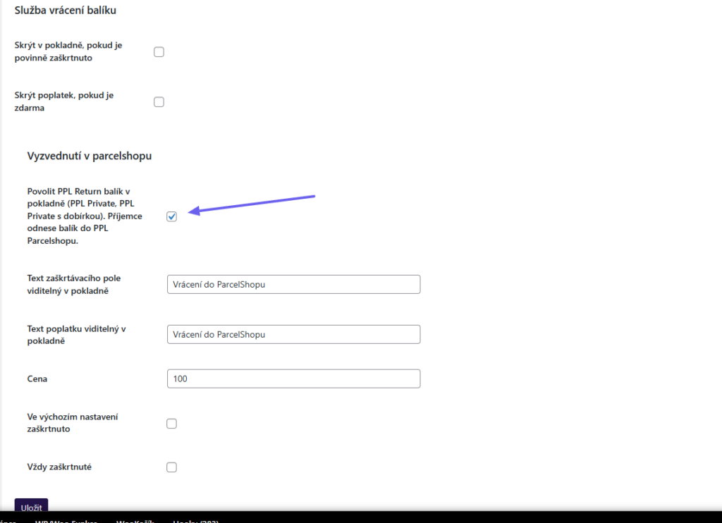 Pro podporované způsoby dopravy je k dispozici také vrácení balíku – s odevzdáním v ParcelShopu. Službu je nutné aktivovat – checkbox Povolit PPL Return balík v pokladně (PPL Private, PPL Private s dobírkou). Příjemce odnese balík do PPL Parcelshopu.